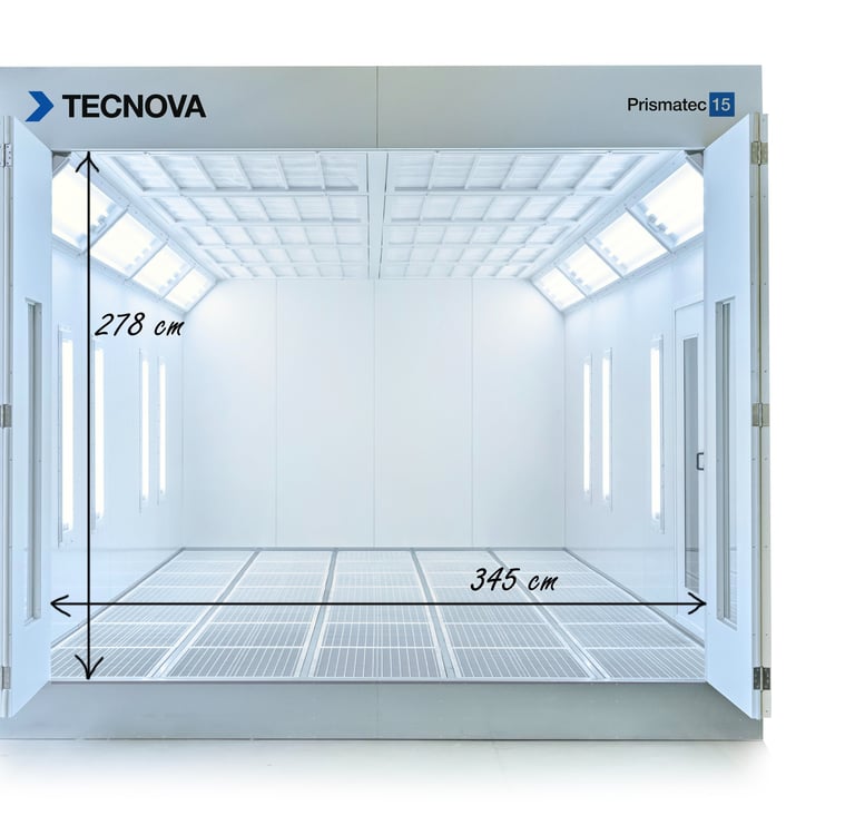 The Prismatec 7x4m model offers the largest entry clearance and door width in its size category — ensuring maximum accessibility for vehicles of any type while maintaining perfect airflow and lighting uniformity inside the booth.